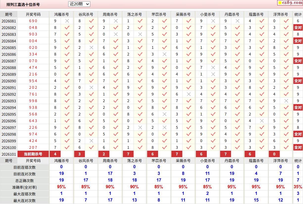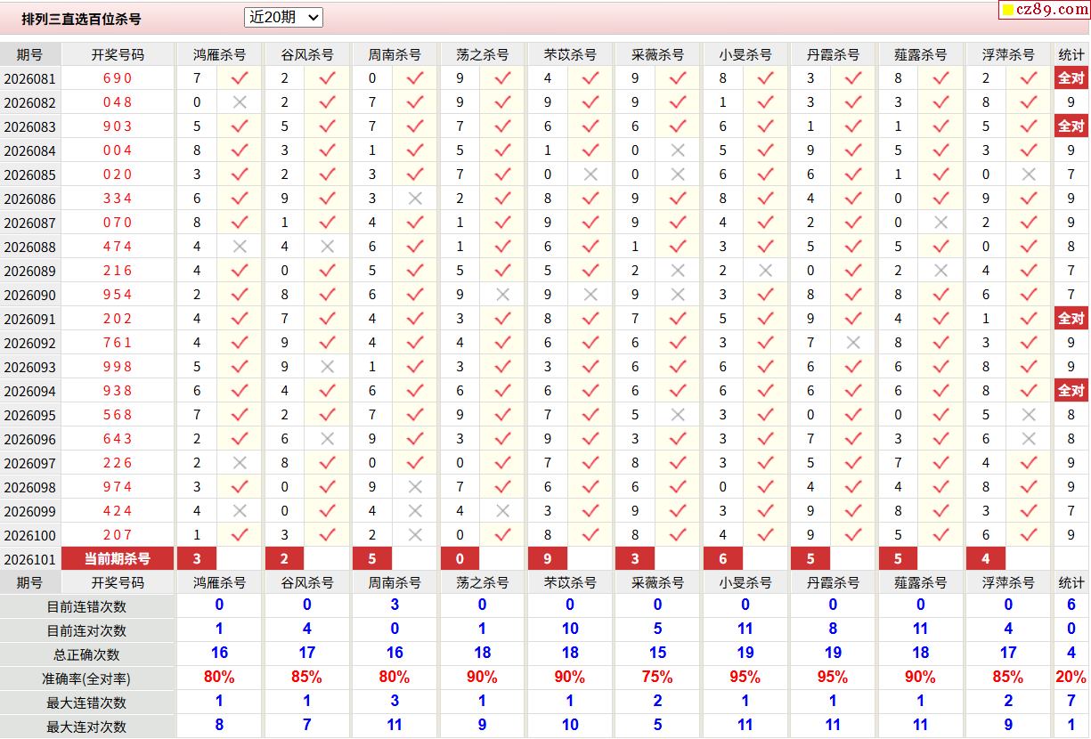 26年101期彩宝贝专家体彩P3杀号定码图表