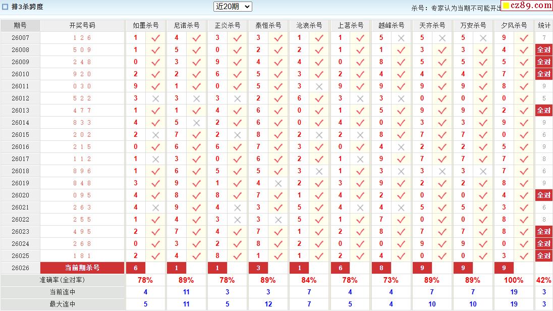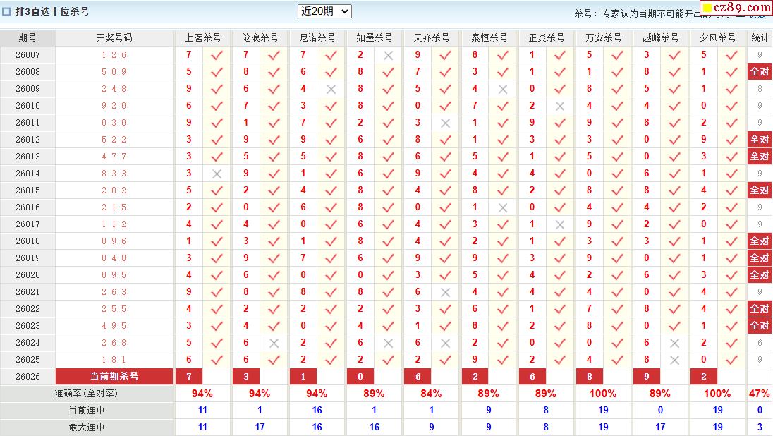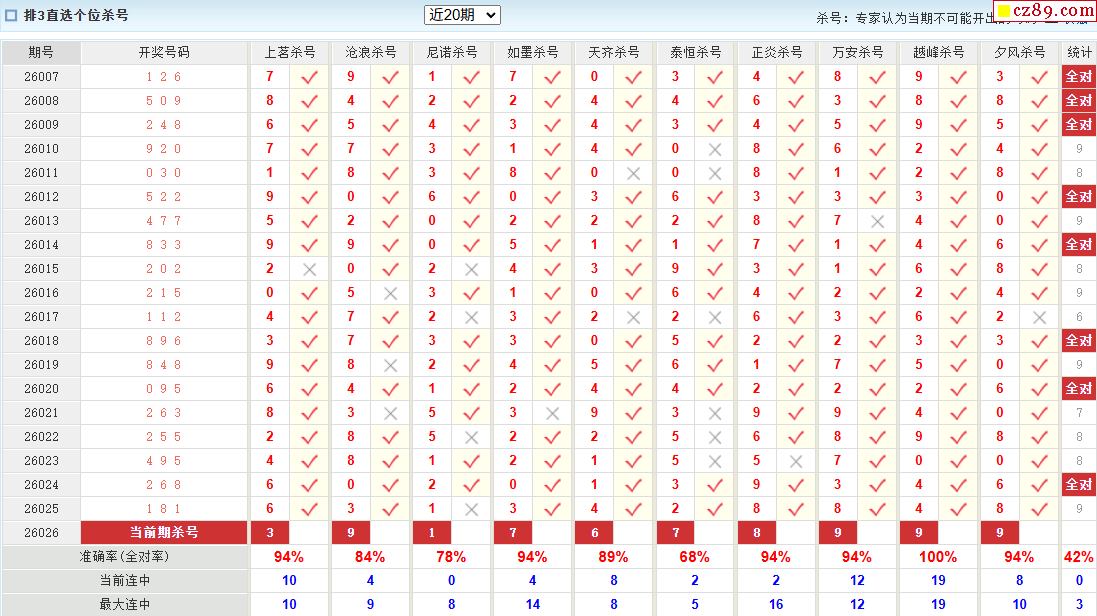 26年026期彩宝贝专家体彩P3杀号定码图表