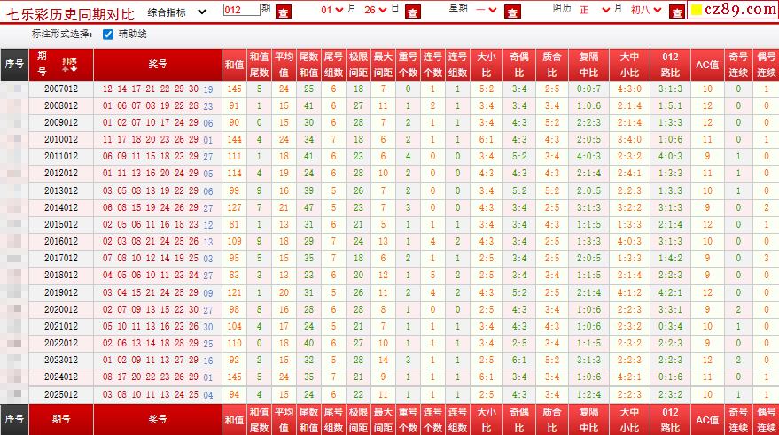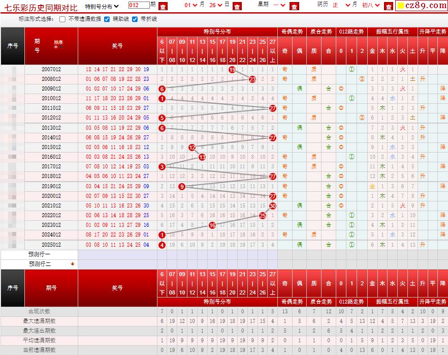 012期七乐彩历史同期对比图