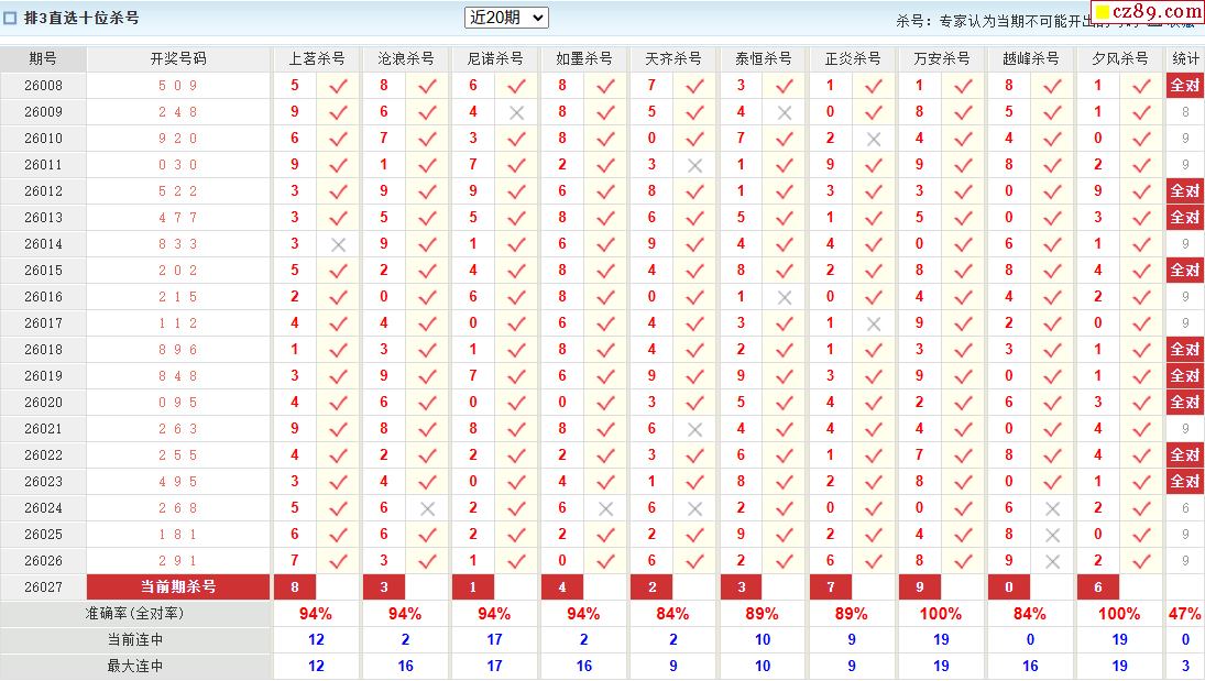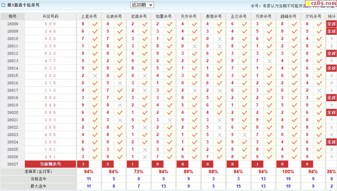 26年027期彩宝贝专家体彩P3杀号定码图表