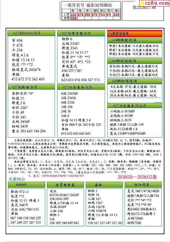 牛彩版3D预测彩报图26年027期打印版