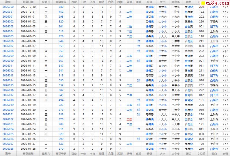 走 势:开奖号走势跨度走势和值走势