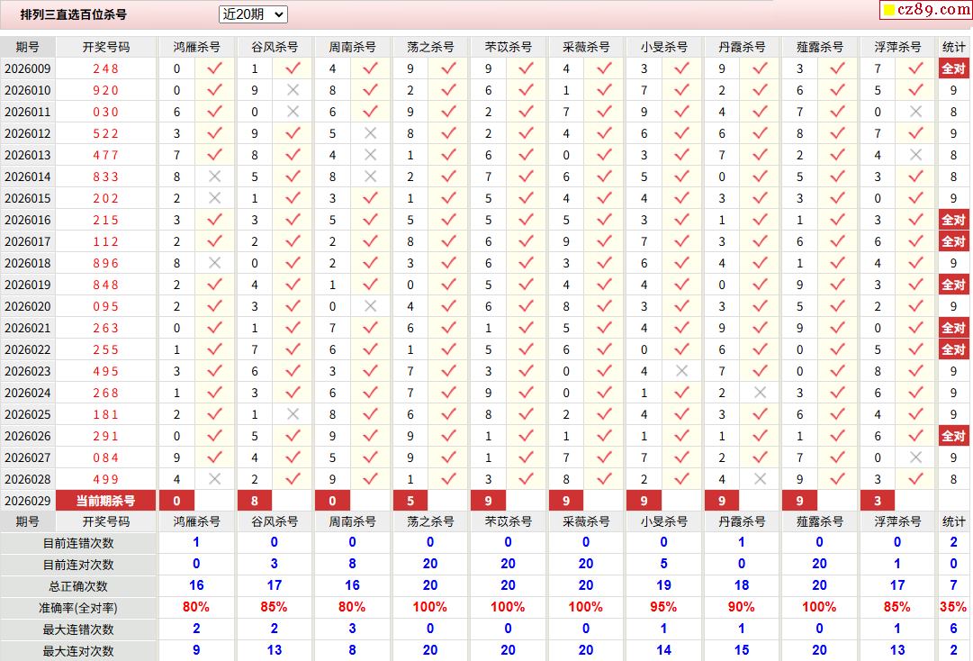 26年029期彩宝贝专家体彩P3杀号定码图表