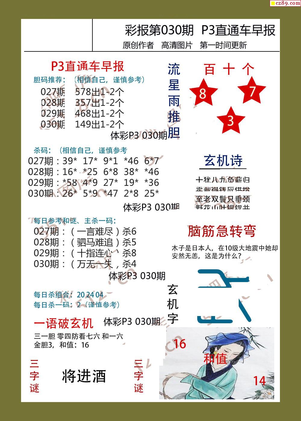 2026年030期牛彩网体彩P3画迷图谜汇总分享