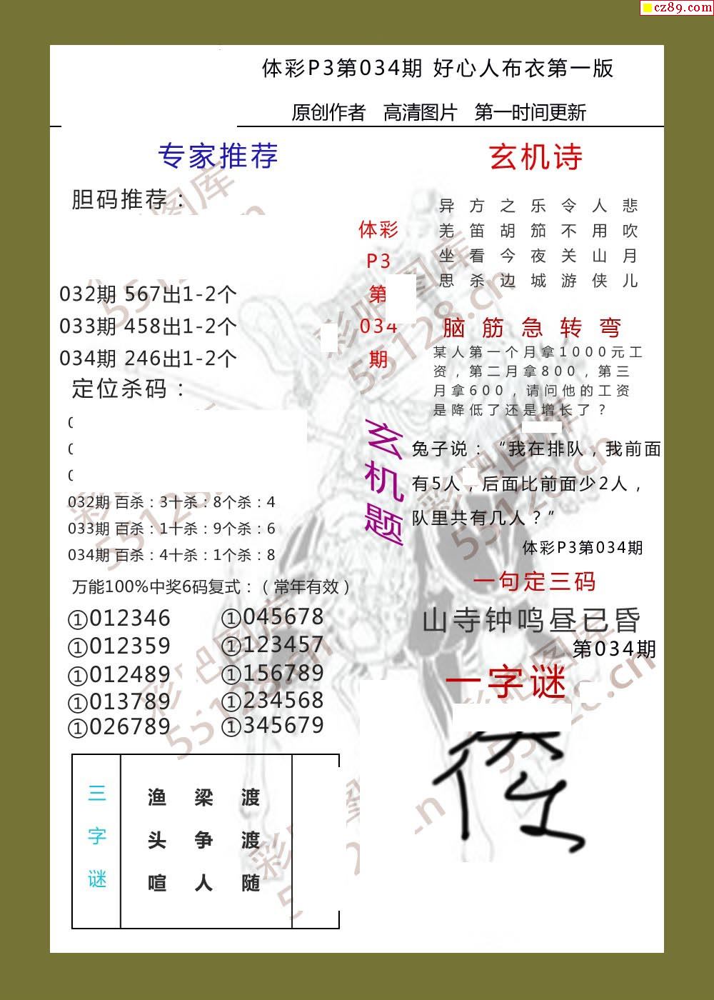 好心人布衣AB版034期体彩p3图谜
