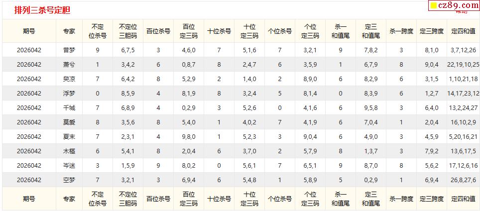 26年042期彩宝贝专家体彩P3杀号定码图表