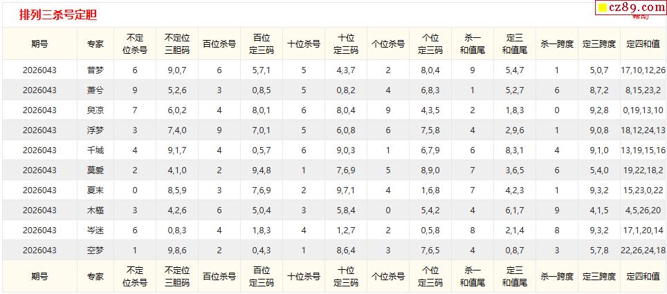 26年043期彩宝贝专家体彩P3杀号定码图表