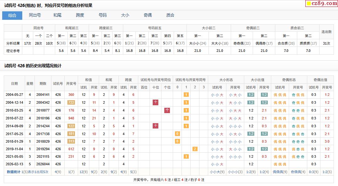 044期福彩3D试机号426对应开奖号的组选分析结果