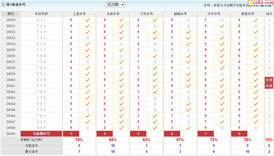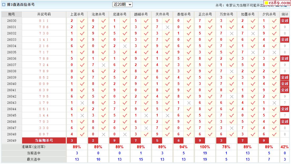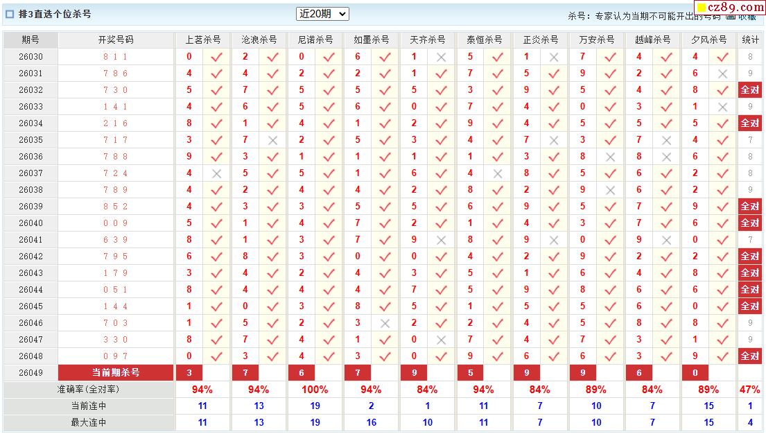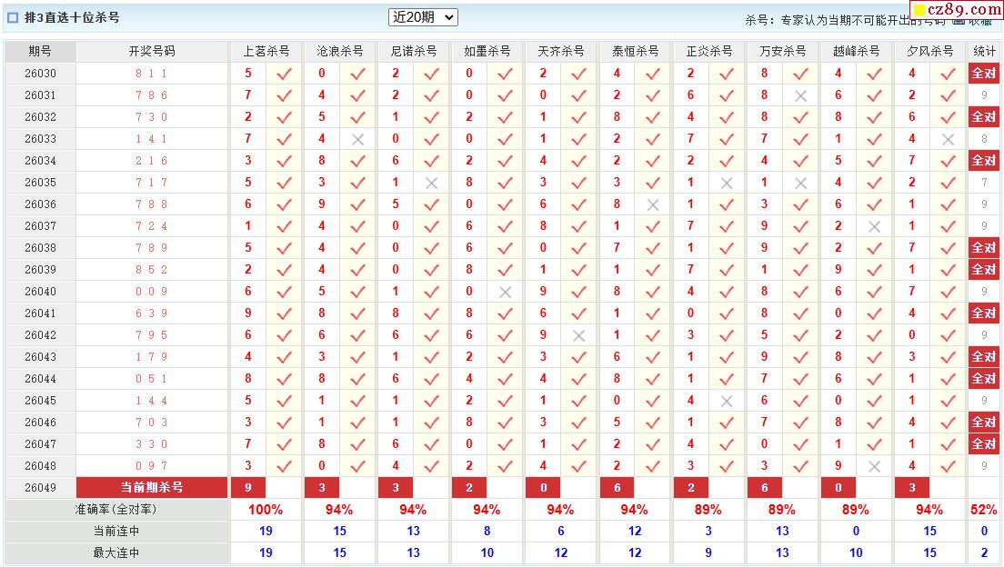 26年049期彩宝贝专家体彩P3杀号定码图表
