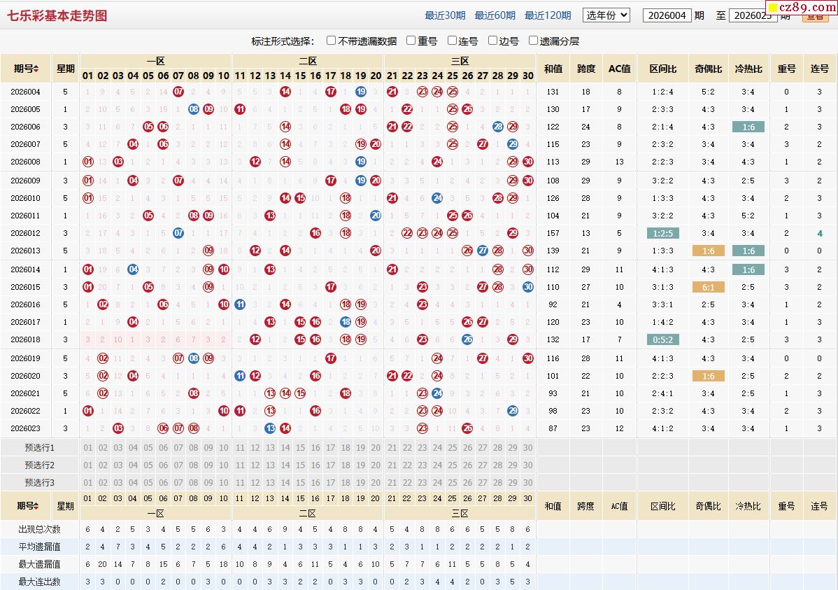 2026年024期福彩七乐彩近期走势图分析