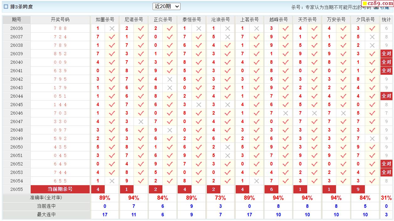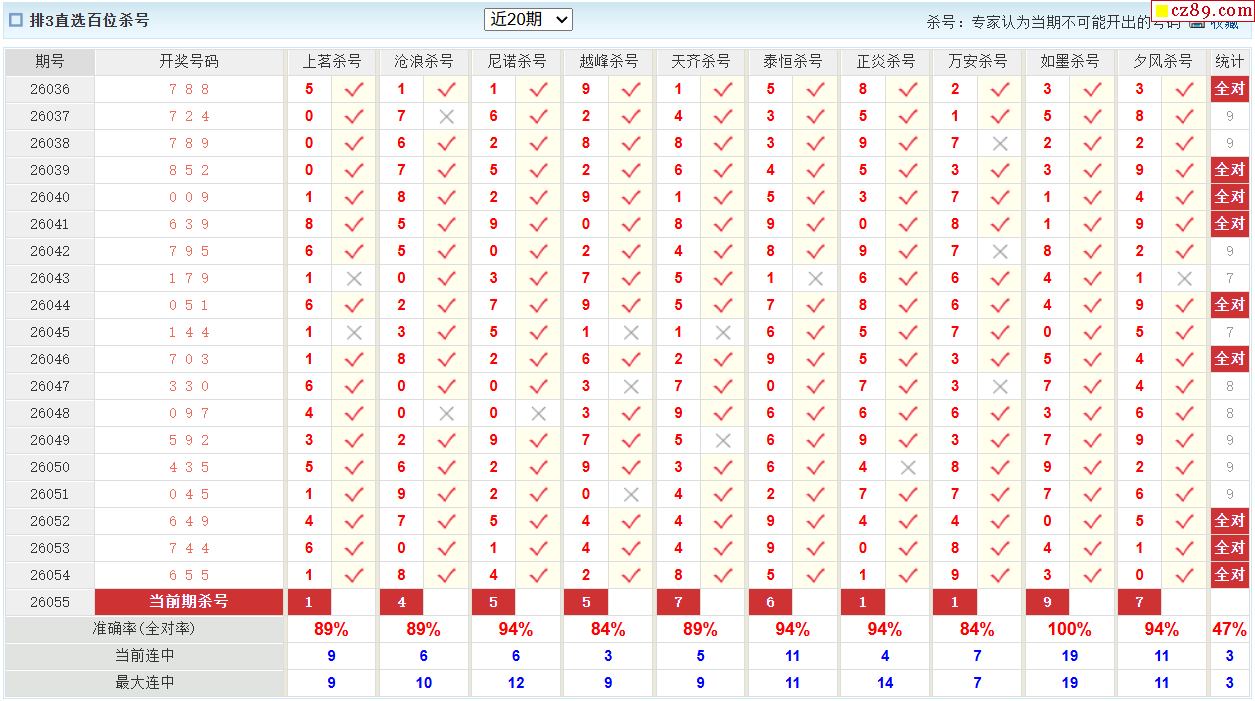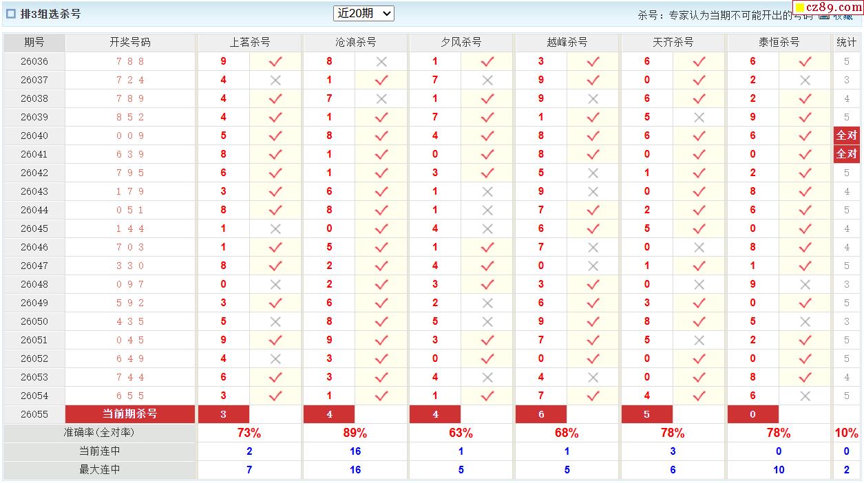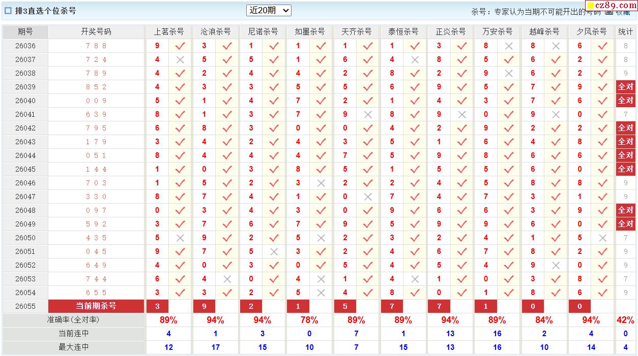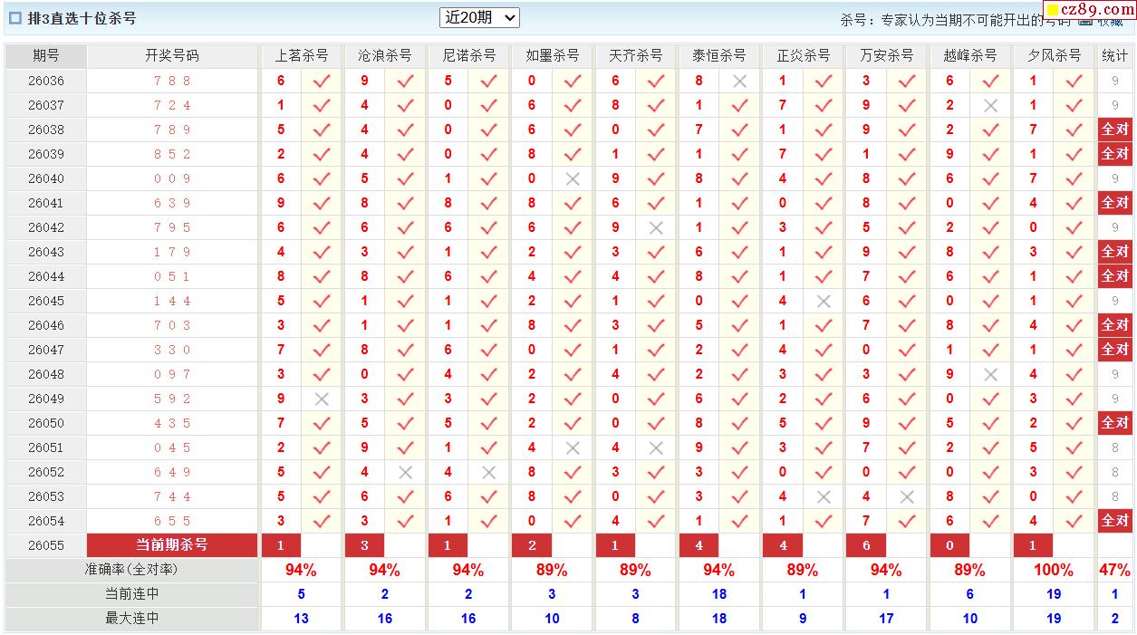 26年055期彩宝贝专家体彩P3杀号定码图表