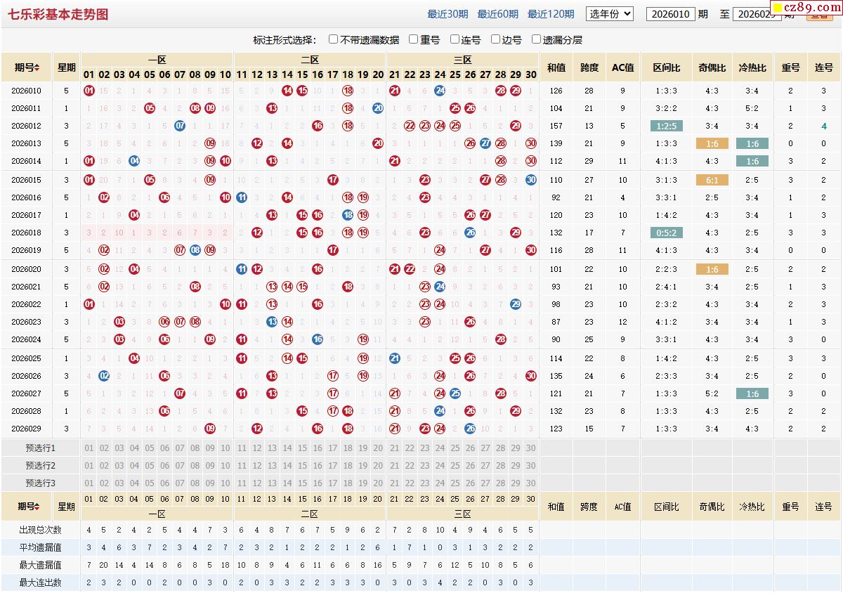 2026年030期福彩七乐彩近期走势图分析