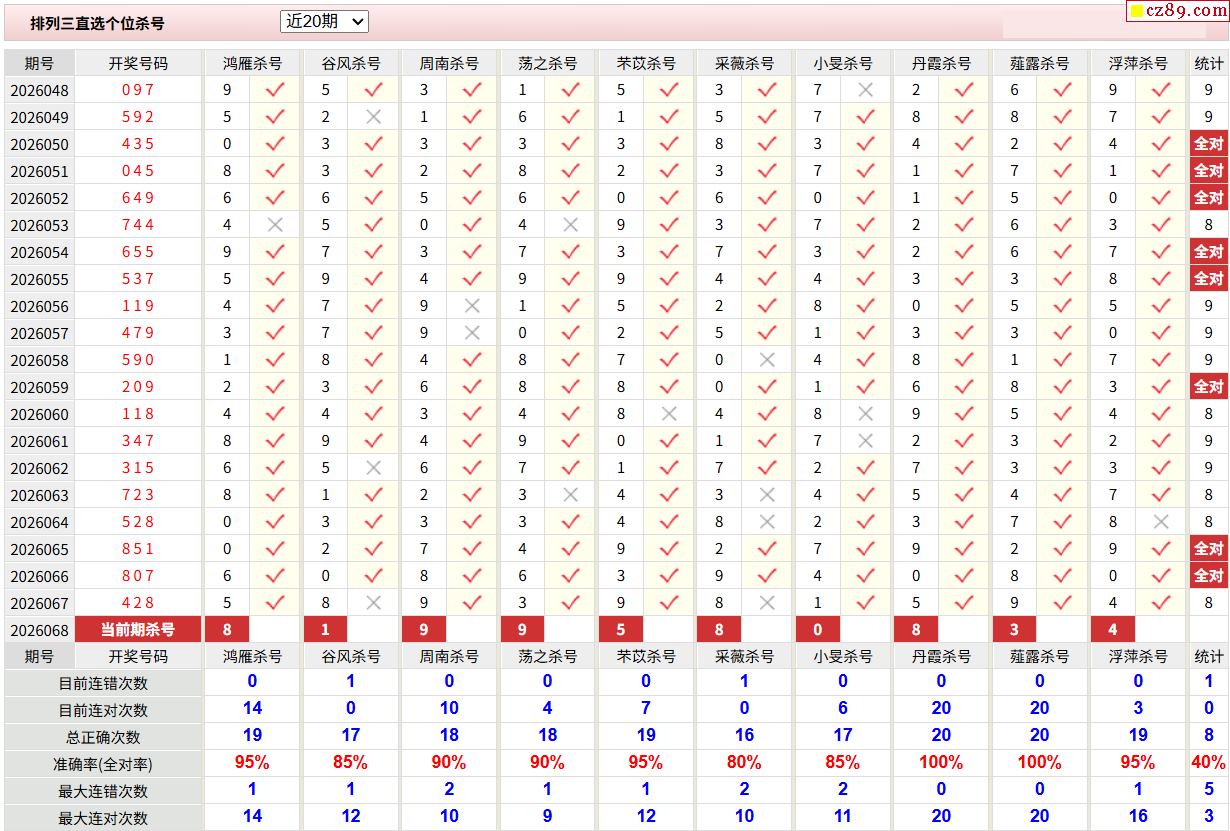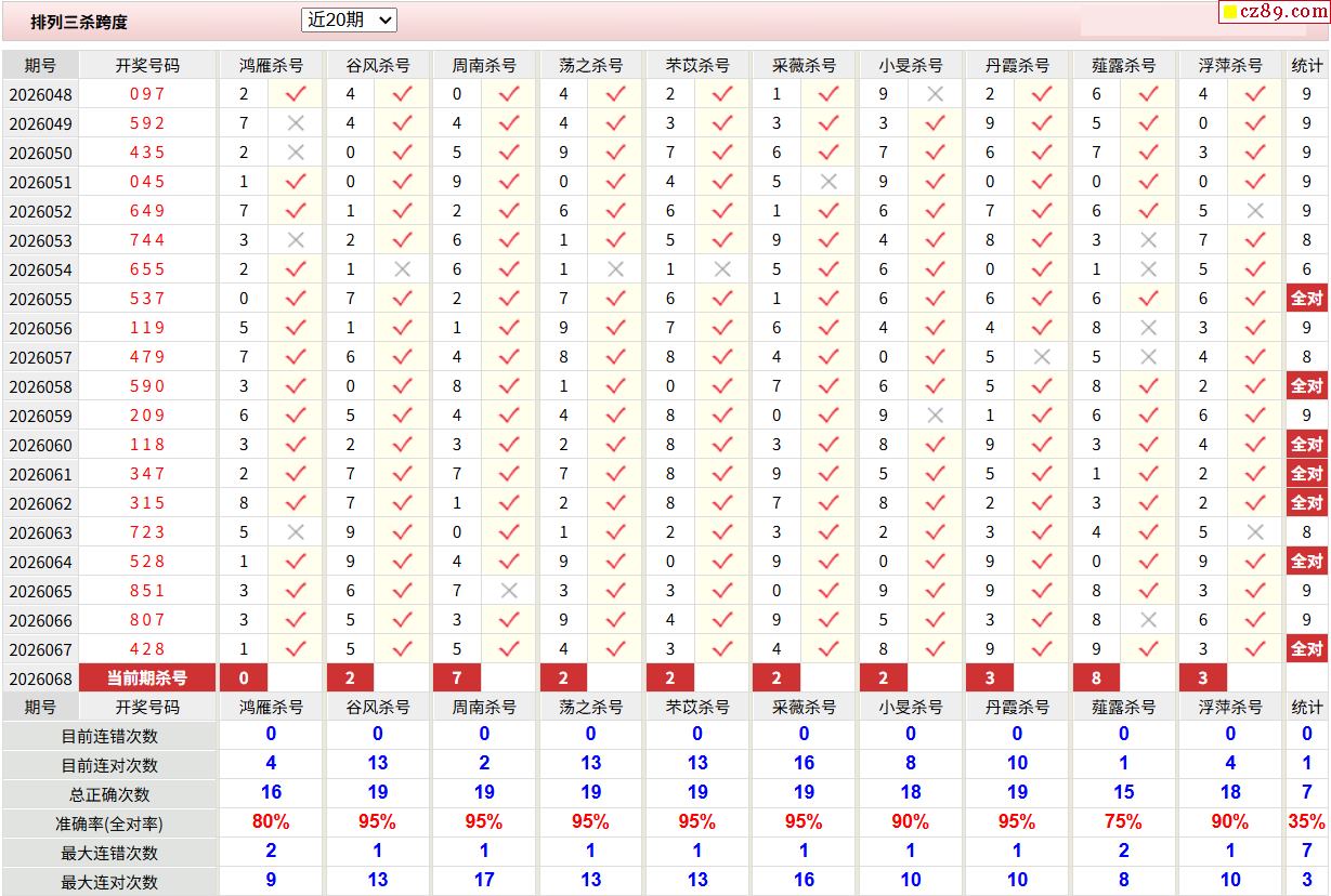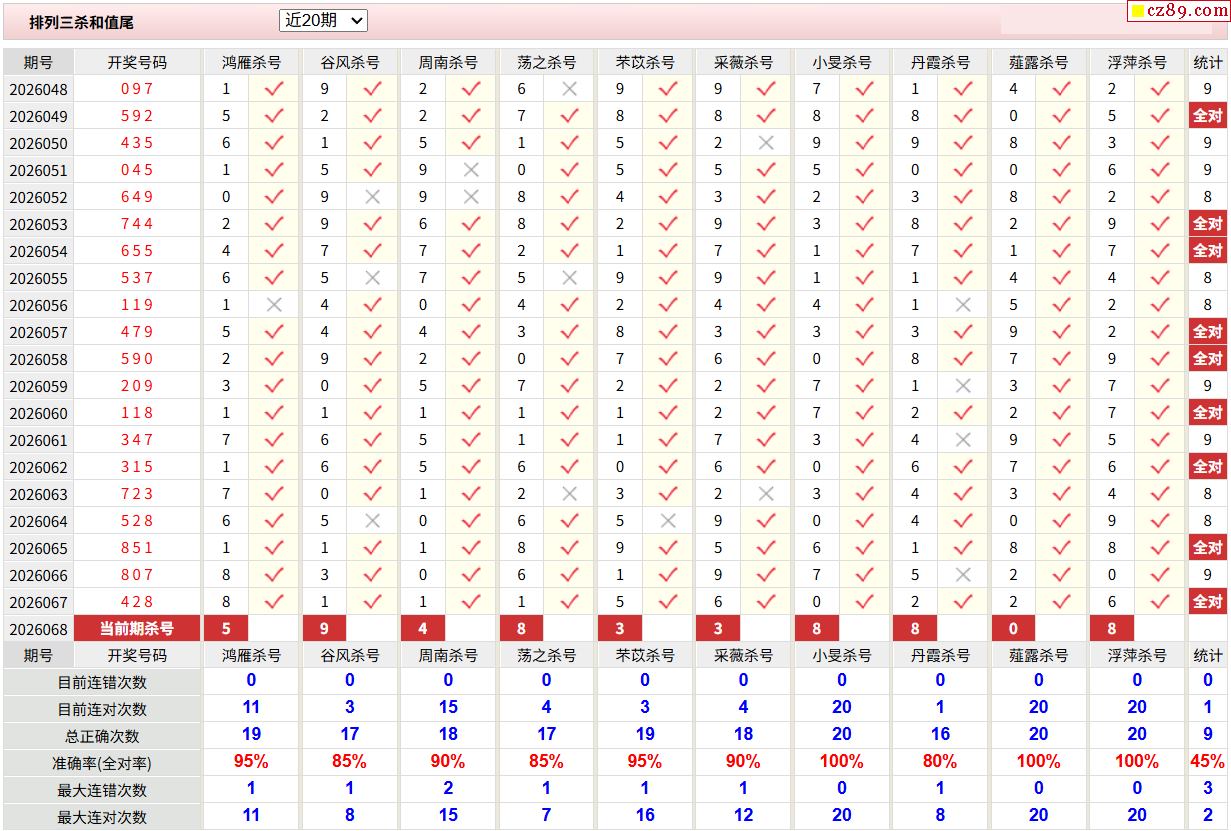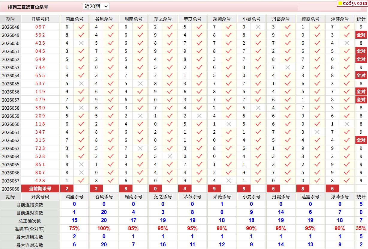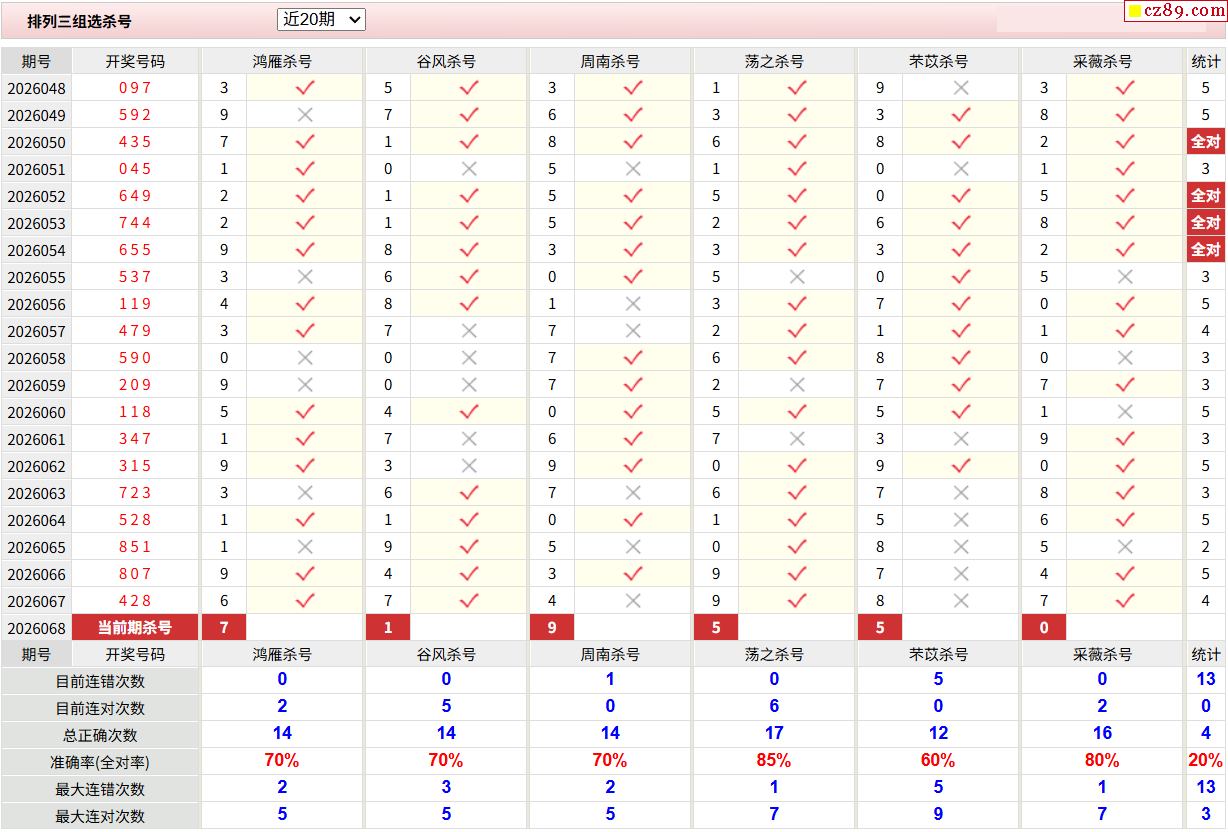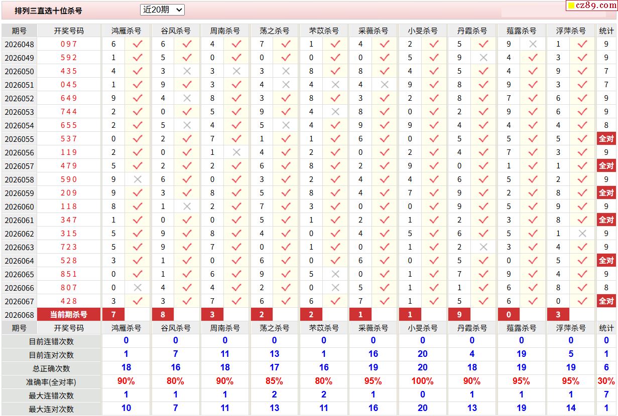 26年068期彩宝贝专家体彩P3杀号定码图表