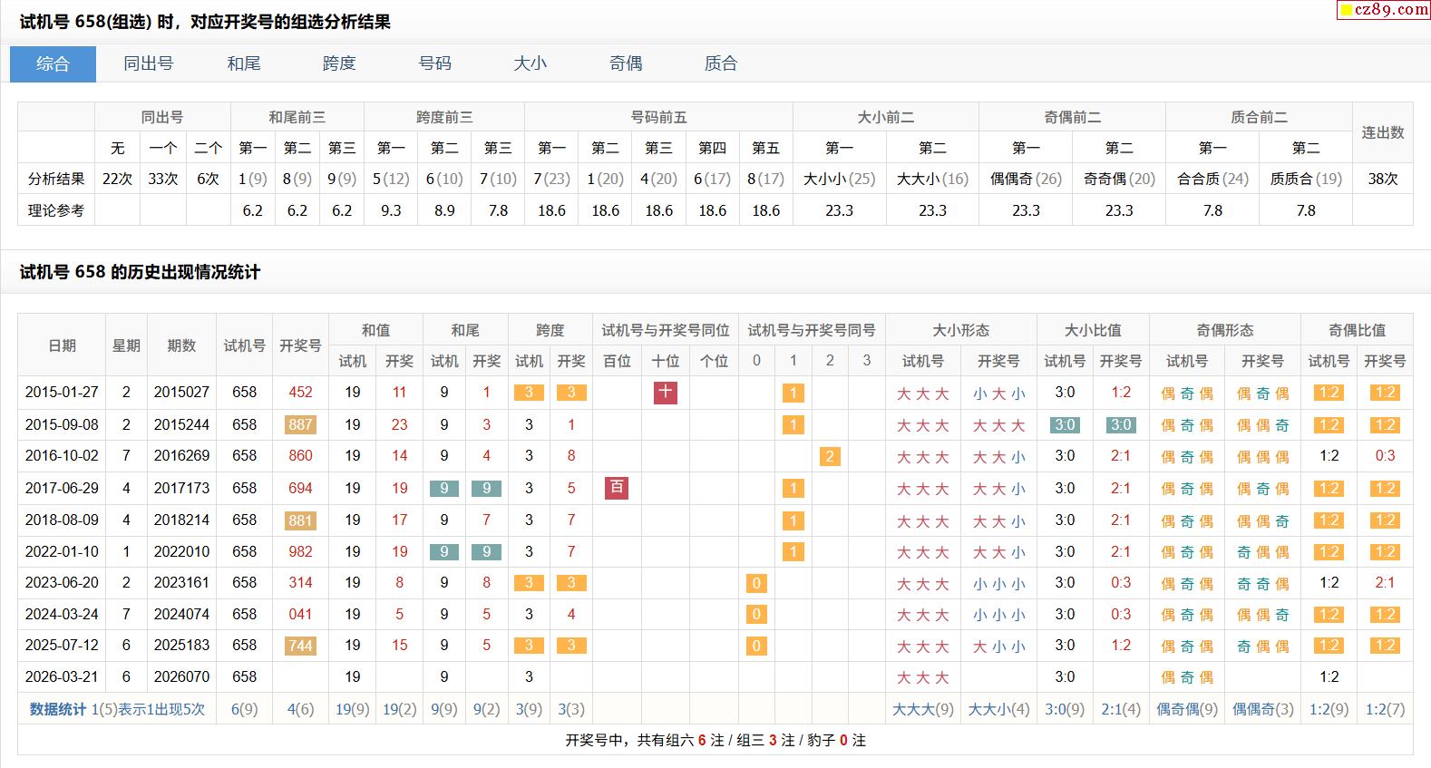070期福彩3D试机号658对应开奖号的组选分析结果
