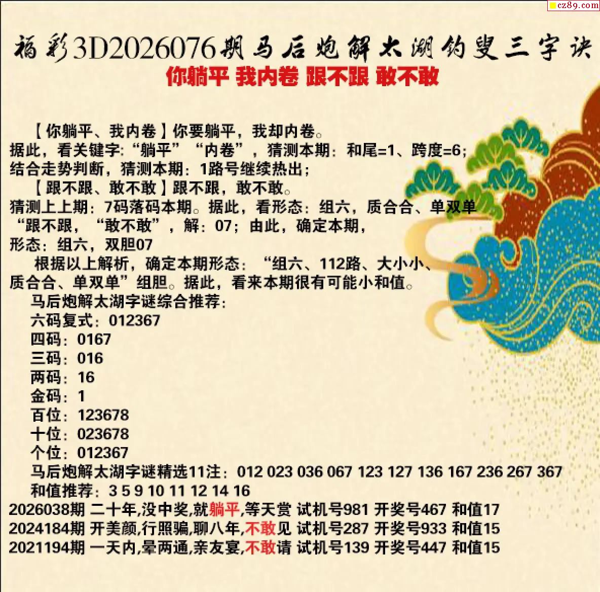 马后炮解26年076期3d太湖钓叟之 敢不敢