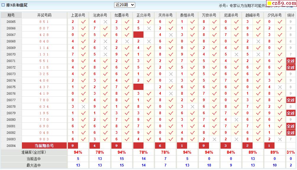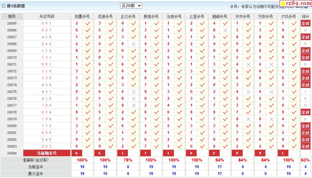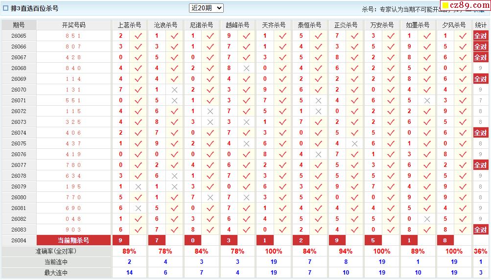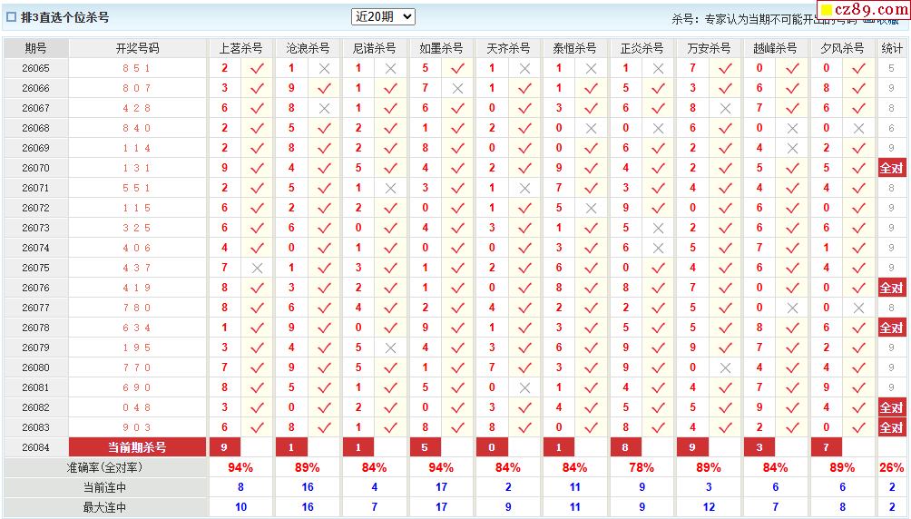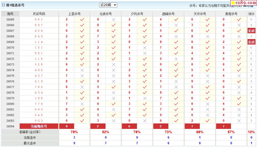 26年084期彩宝贝专家体彩P3杀号定码图表