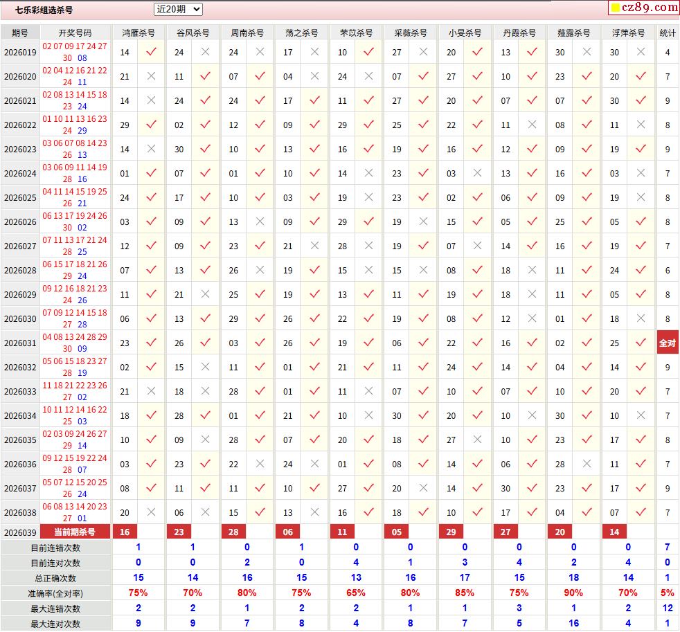26年039期彩票专家福彩七乐彩杀号图表