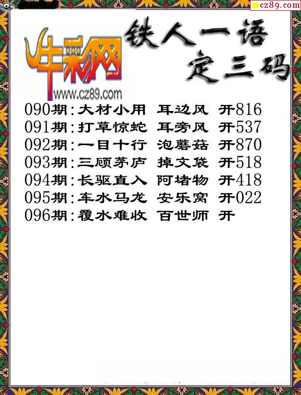 福彩3D2026096期铁人一句定三码字图谜