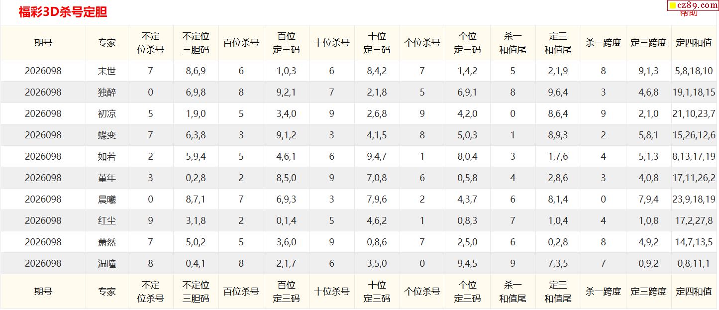 26年098期彩宝贝专家福彩3D杀号定码图表