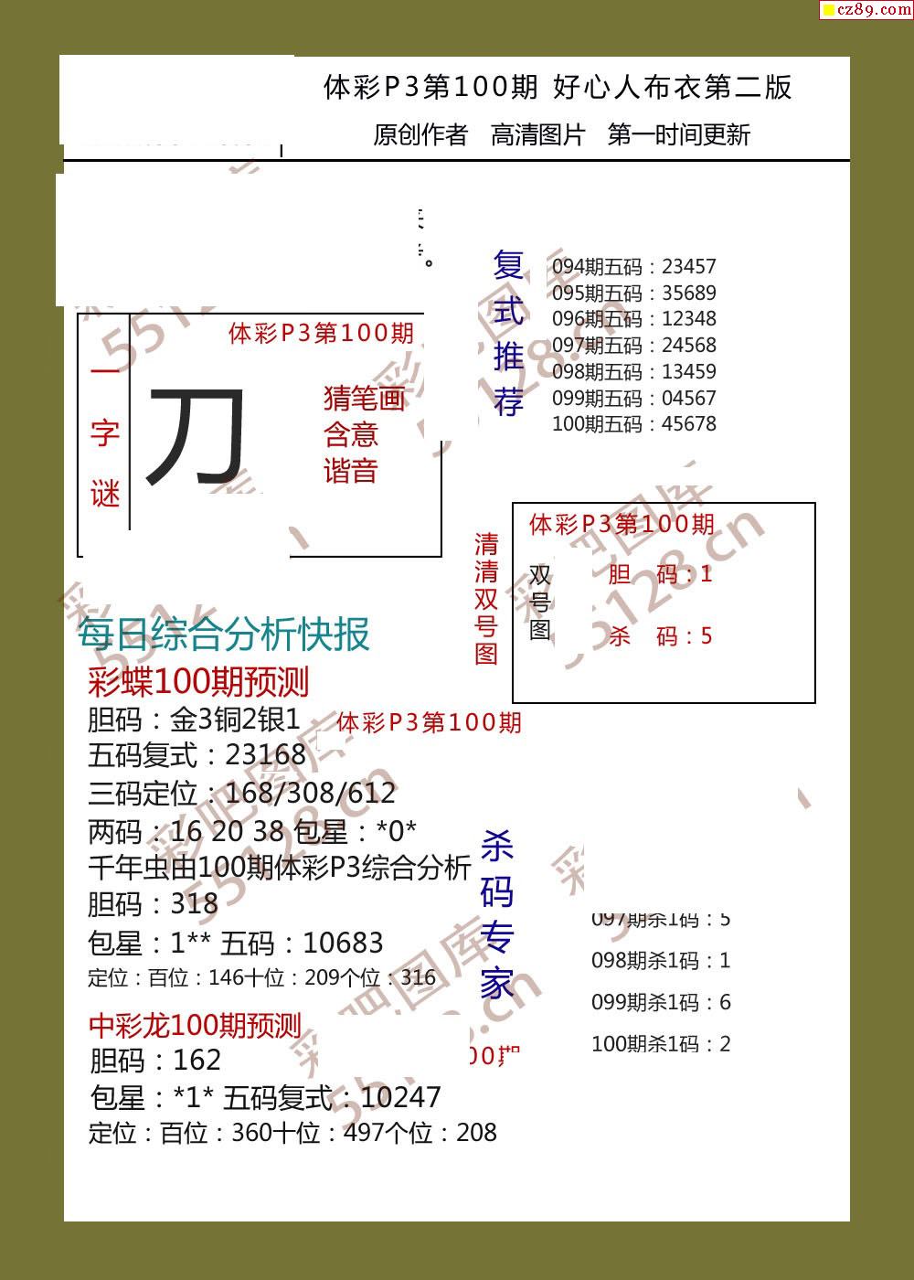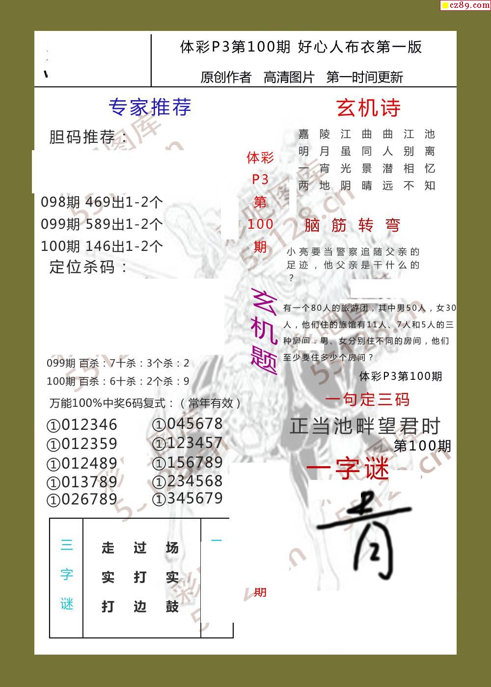好心人布衣AB版100期体彩p3图谜