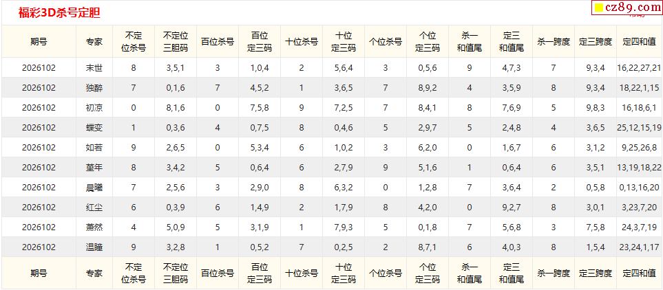26年102期彩宝贝专家福彩3D杀号定码图表