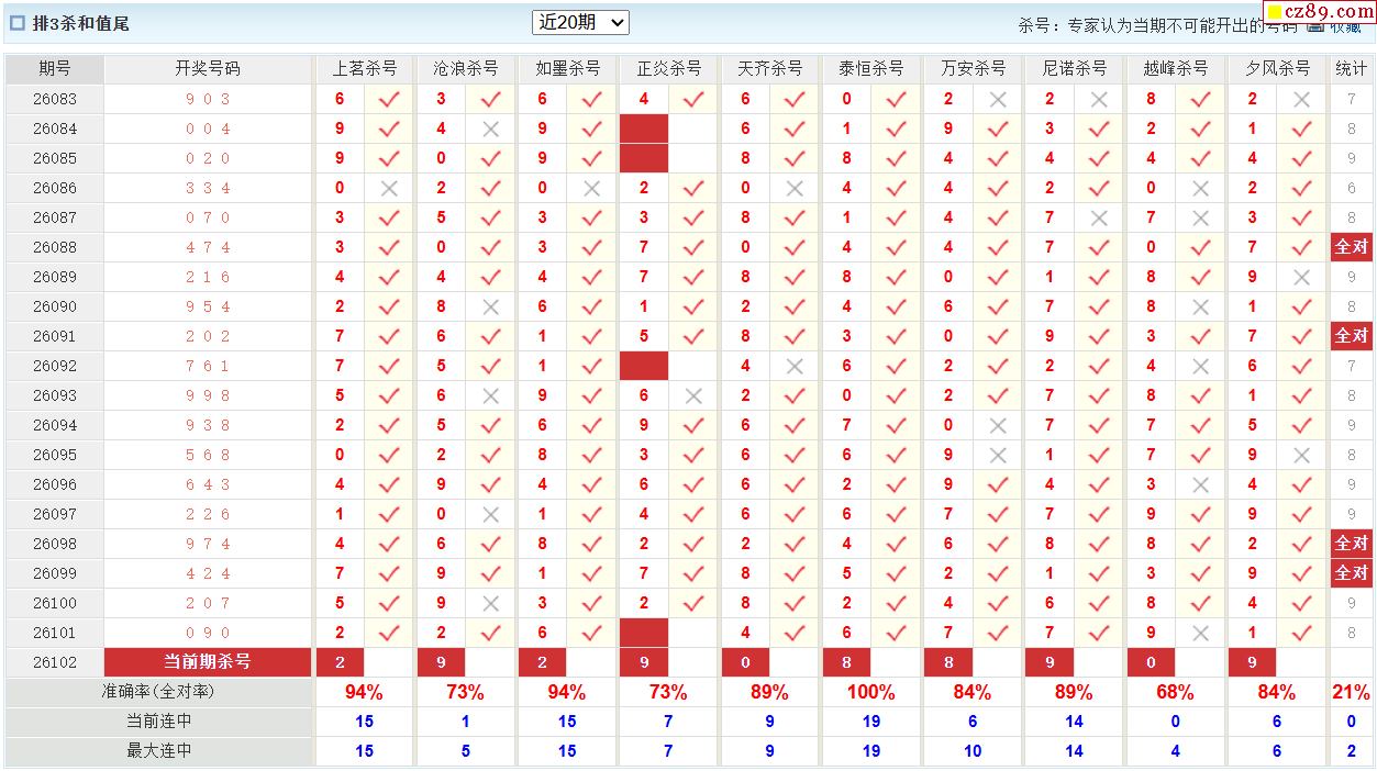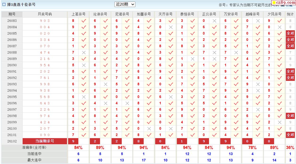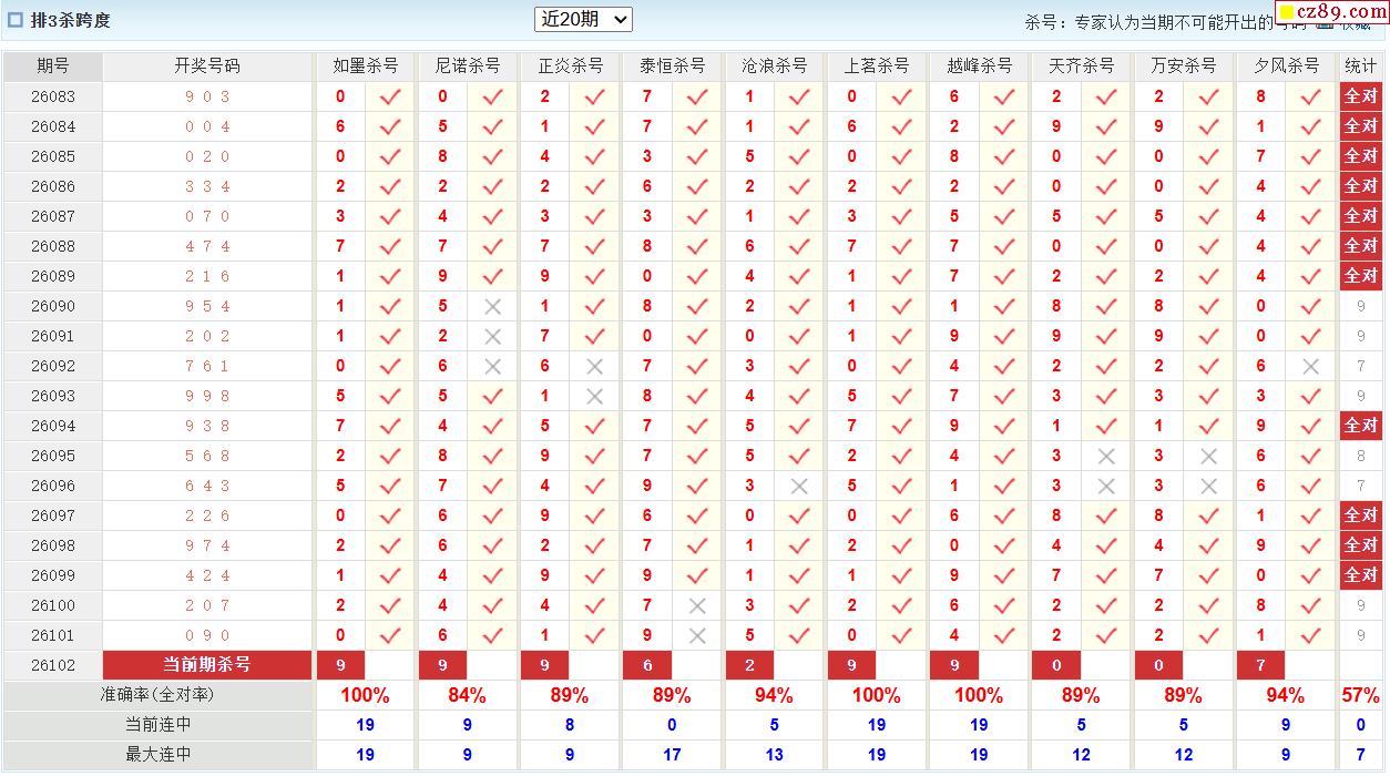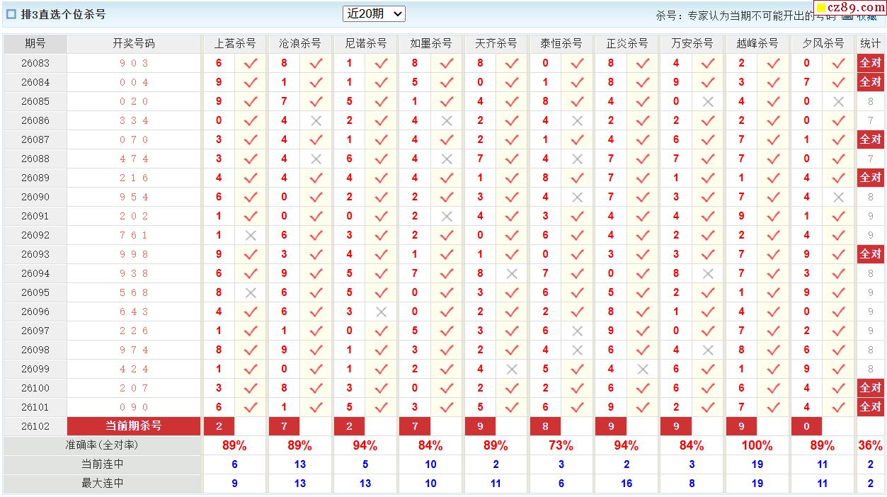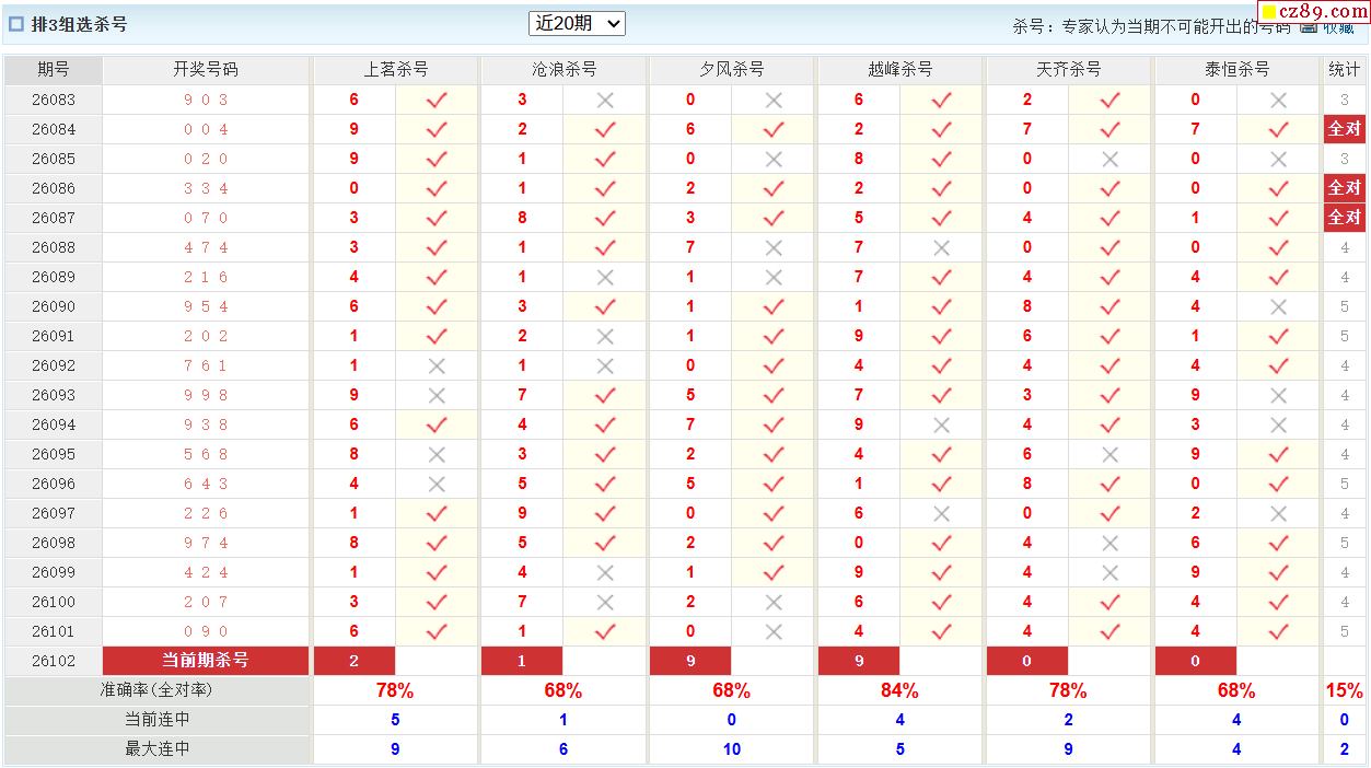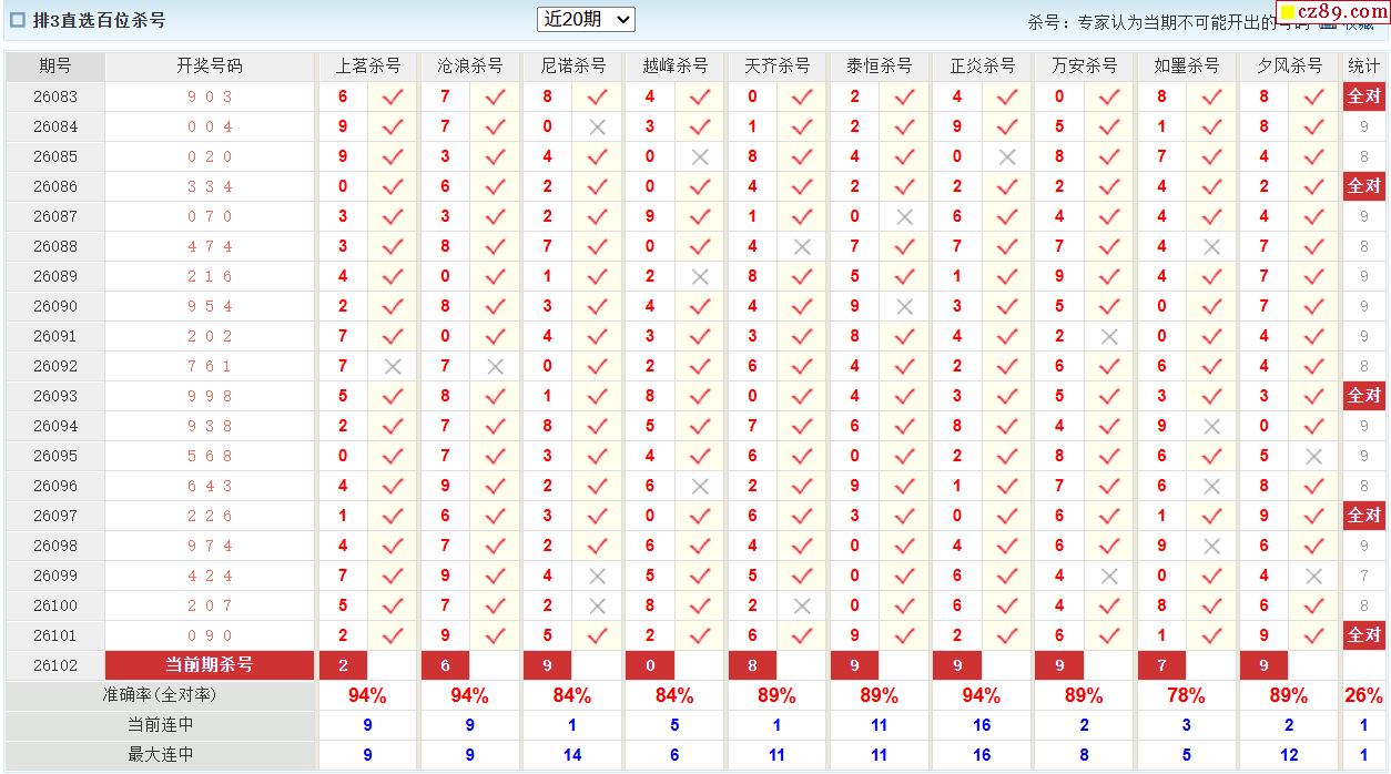 26年102期彩宝贝专家体彩P3杀号定码图表