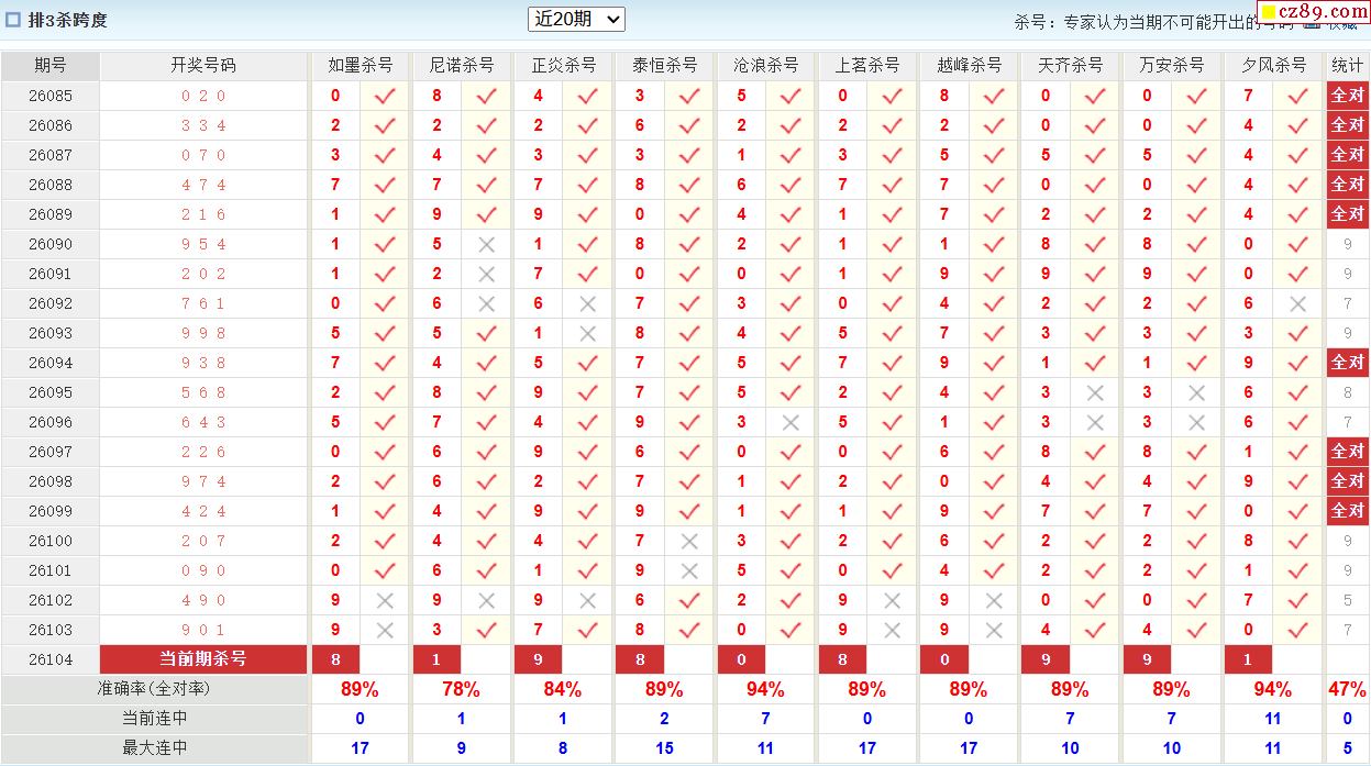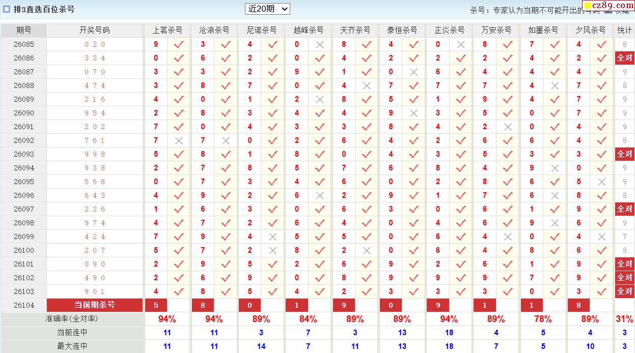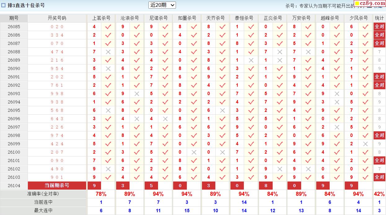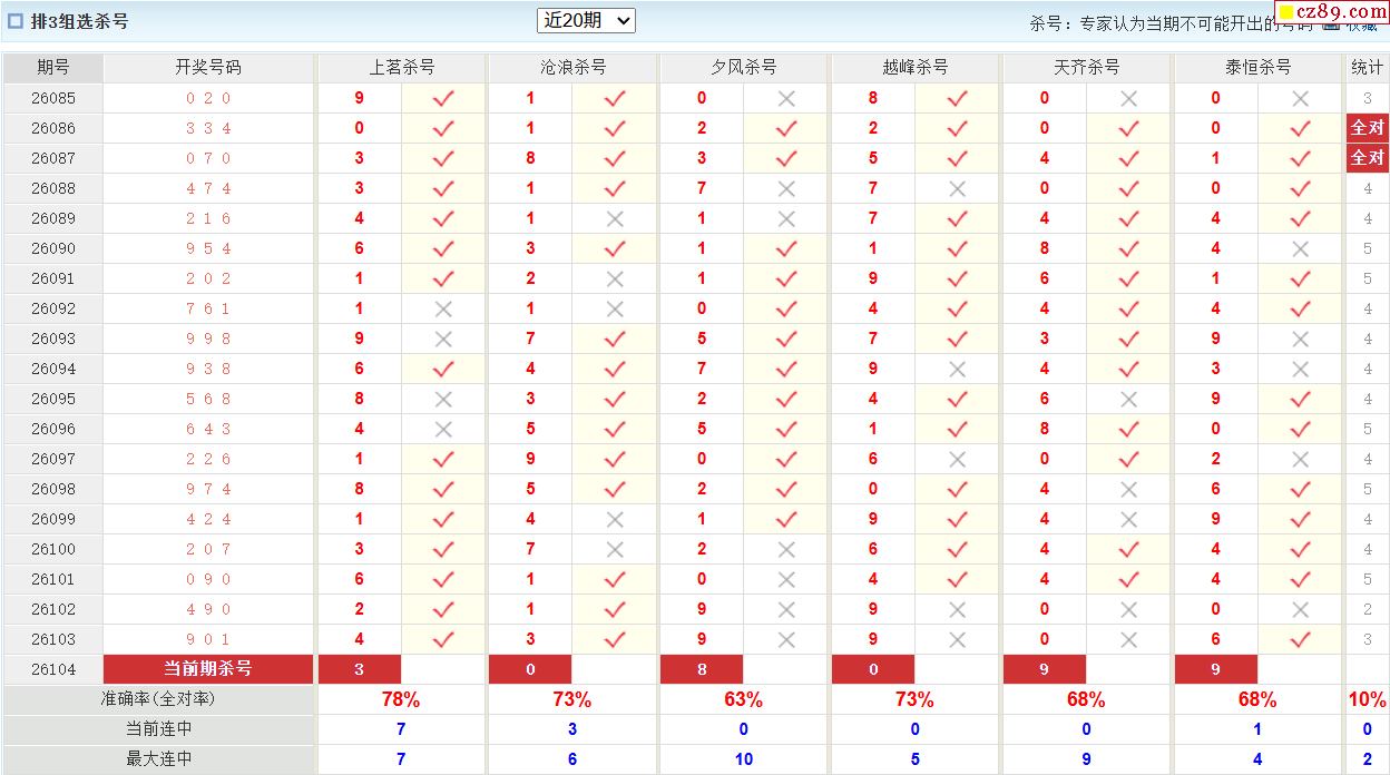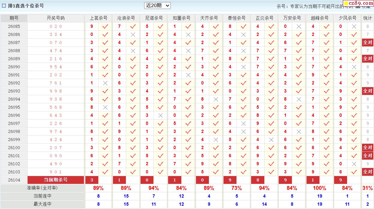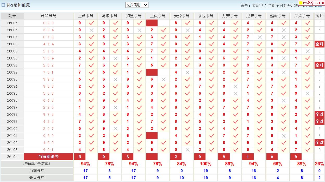 26年104期彩宝贝专家体彩P3杀号定码图表