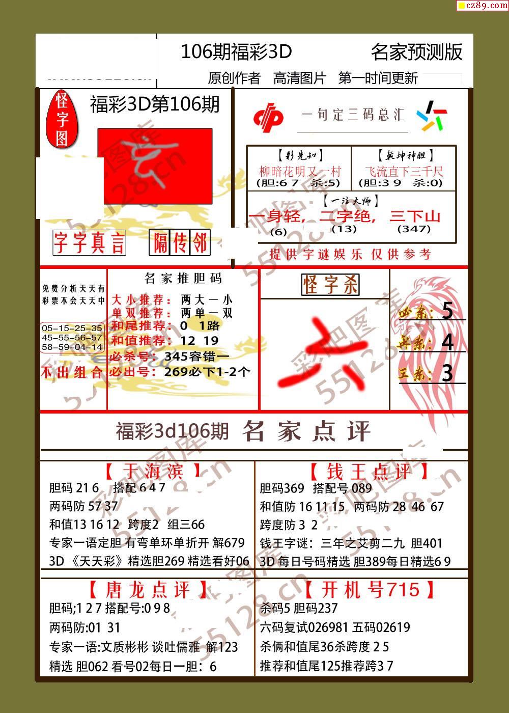 26年106期福彩3d牛彩名家预测图谜