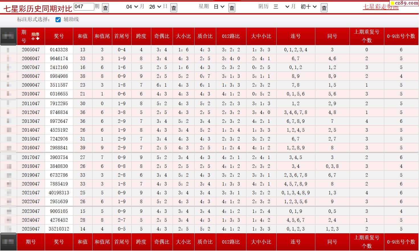 047期七星彩历史同期对比图