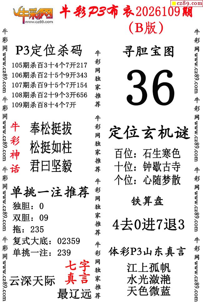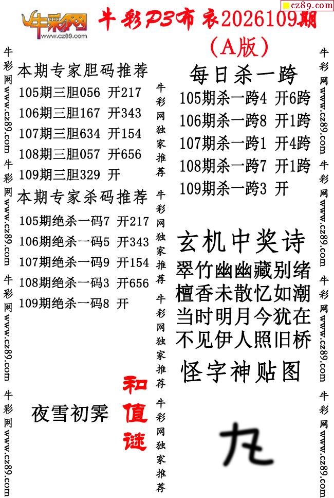 2026年109期牛彩网体彩P3画迷图谜汇总分享