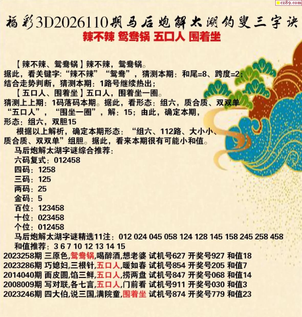 十万火福彩3D26年110期精解太湖钓叟 五口人