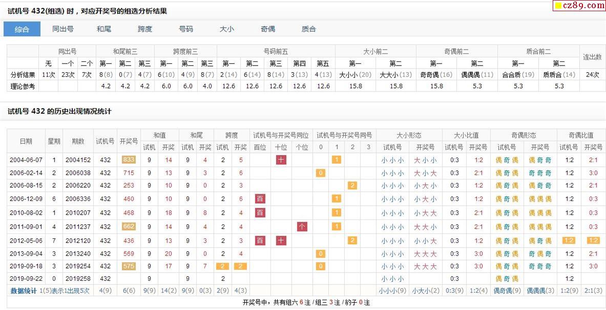 258期福彩3D试机号432对应开奖号的组选分析结果