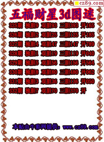 五福财星三胆2025332期3d图谜(原创)