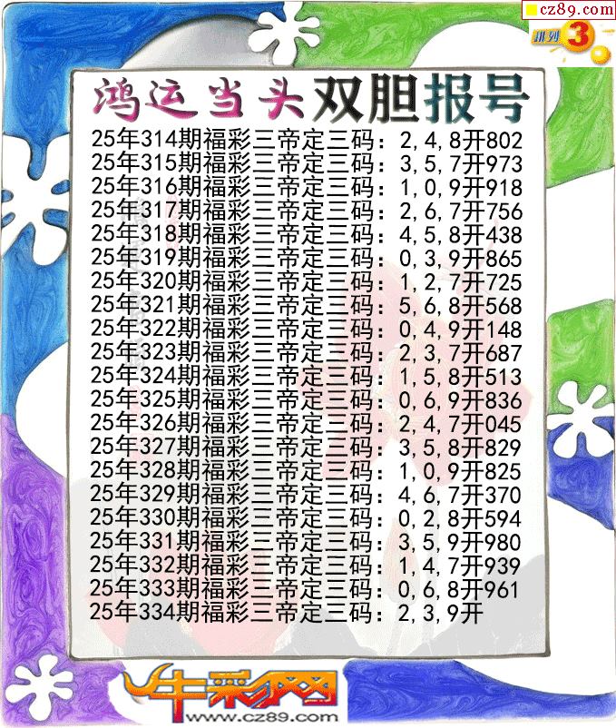 鸿运当头双胆报号334期体彩P3图谜