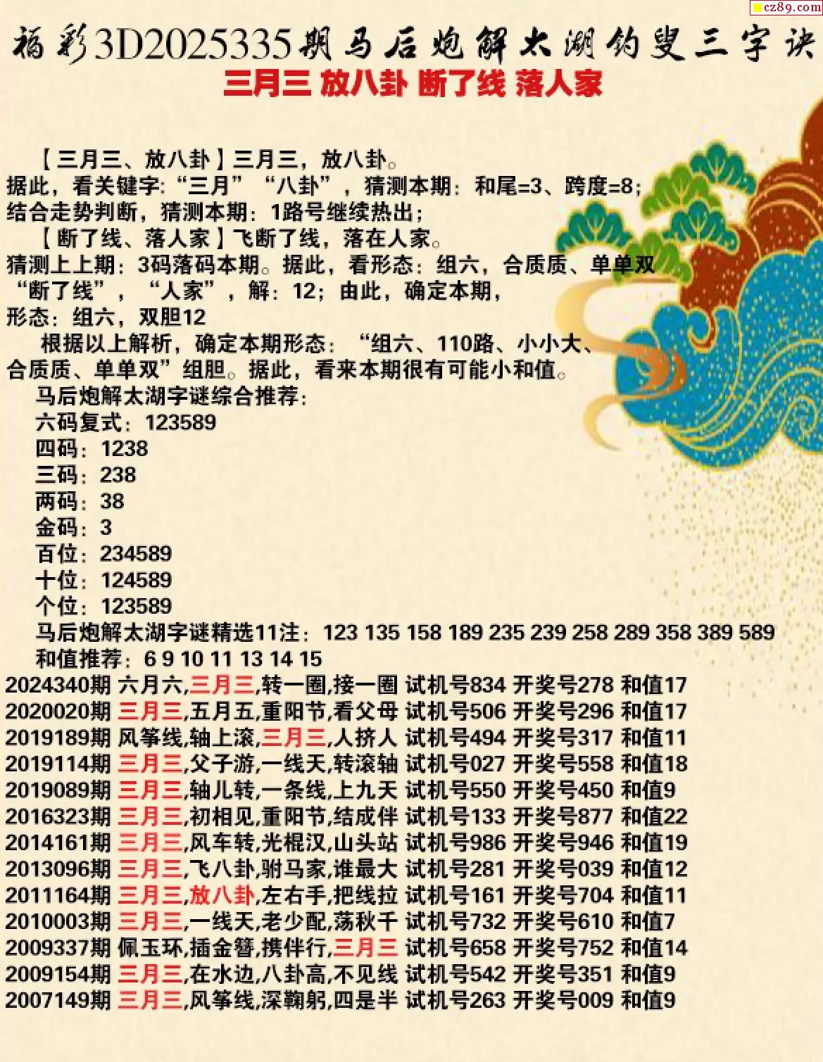 25年335期3d字谜太湖钓叟三字诀《保真》