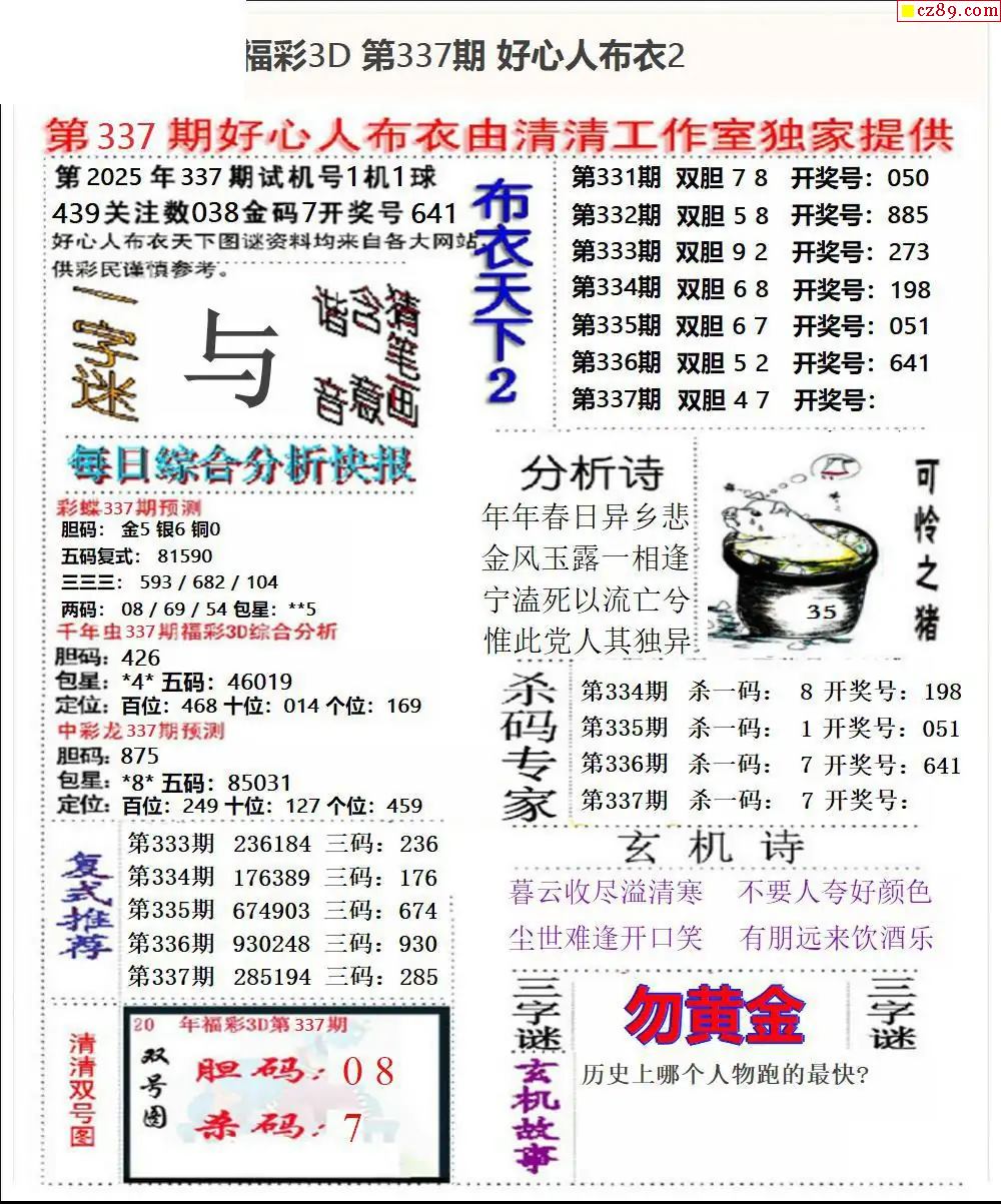 福彩3D2025337期 红尘入世锦鲤吐胆图