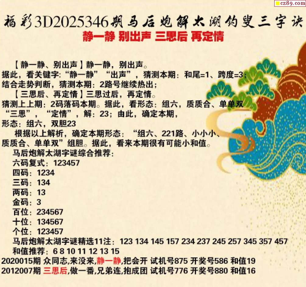 25年346期3d字谜太湖钓叟三字诀《保真》