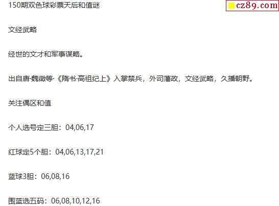 25年福彩双色球150期 彩票天后和值谜
