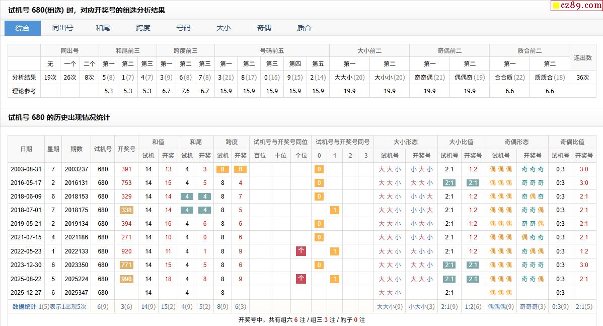 347期福彩3D试机号680对应开奖号的组选分析结果