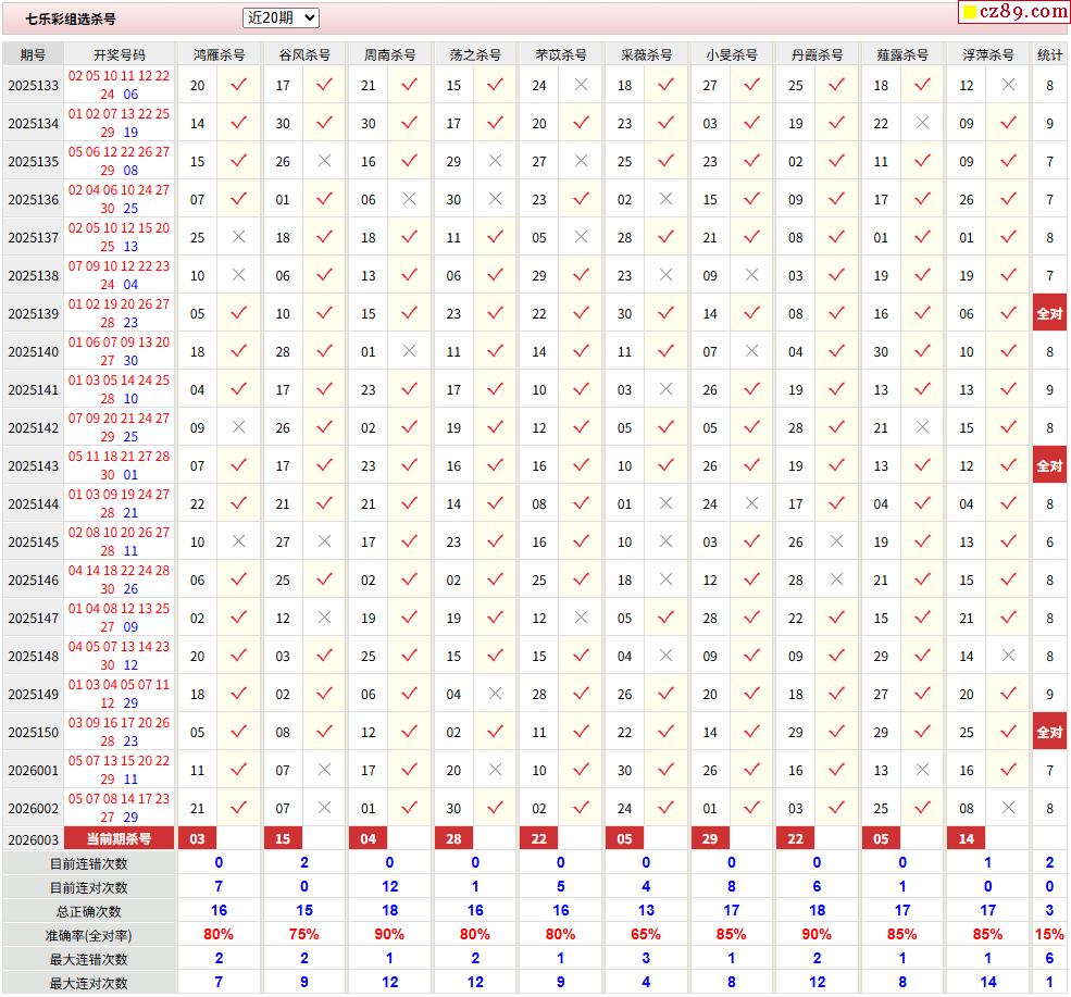 26年003期彩票专家福彩七乐彩杀号图表