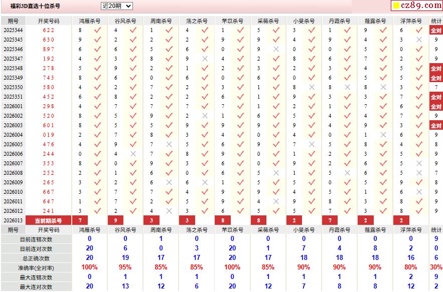 26年013期彩宝贝专家福彩3D杀号定码图表