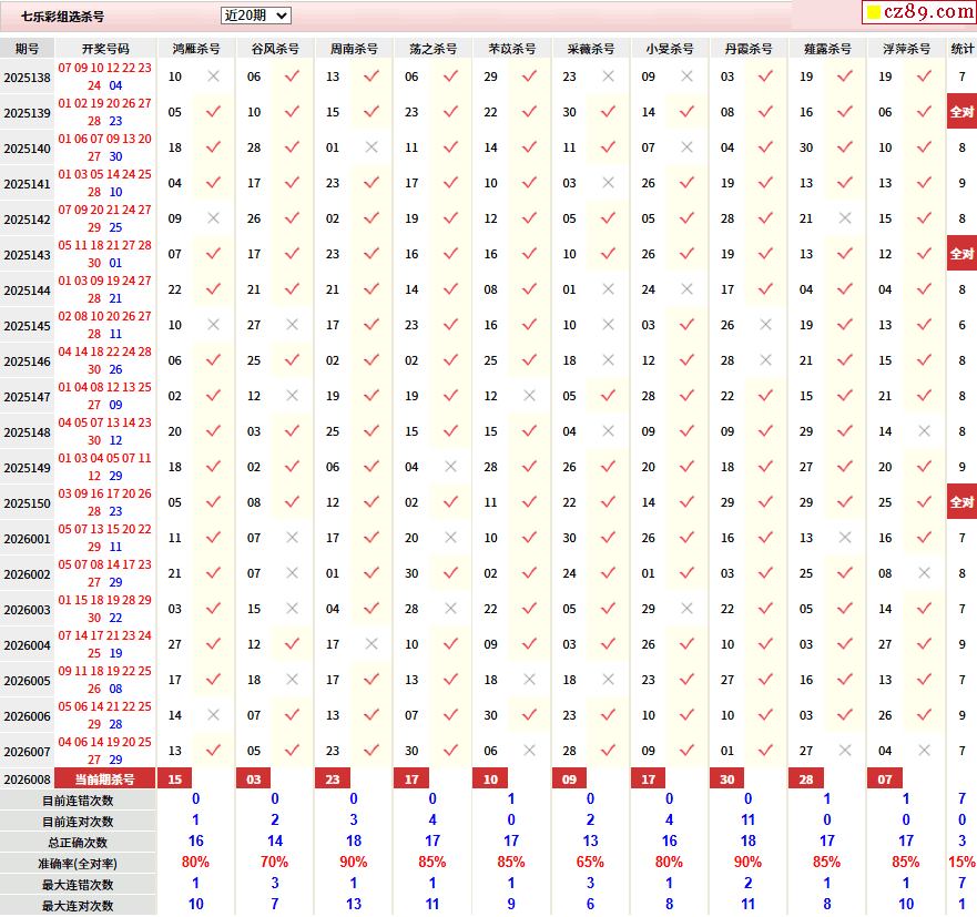 26年008期彩票专家福彩七乐彩杀号图表